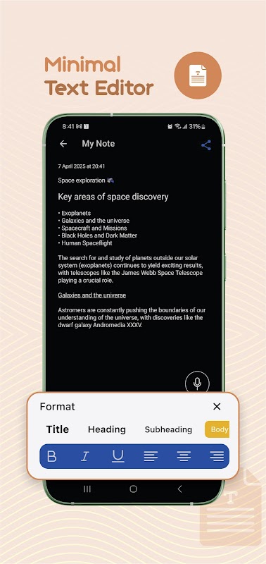 Notely Voice es la app todo en uno para grabar, transcribir y organizar tus notas de voz, sin usar las manos. Ya sea que estés generando ideas, escribiendo un diario, trabajando o estudiando, Notely Voice convierte tus pensamientos en notas estructuradas y editables al instante.
