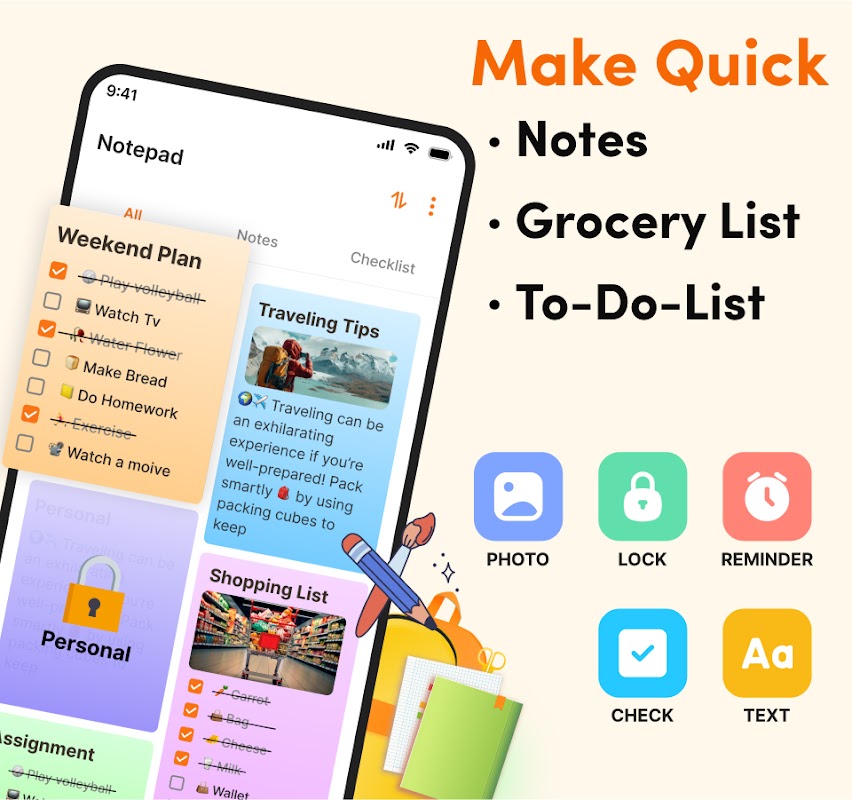 Escribe una nota, crea una lista de compras y configura recordatorios con alarmas en las notas del calendario 📅. Disfrute de notas, cuadernos y blocs de notas en colores fluidos con una interfaz limpia y funciones sólidas.