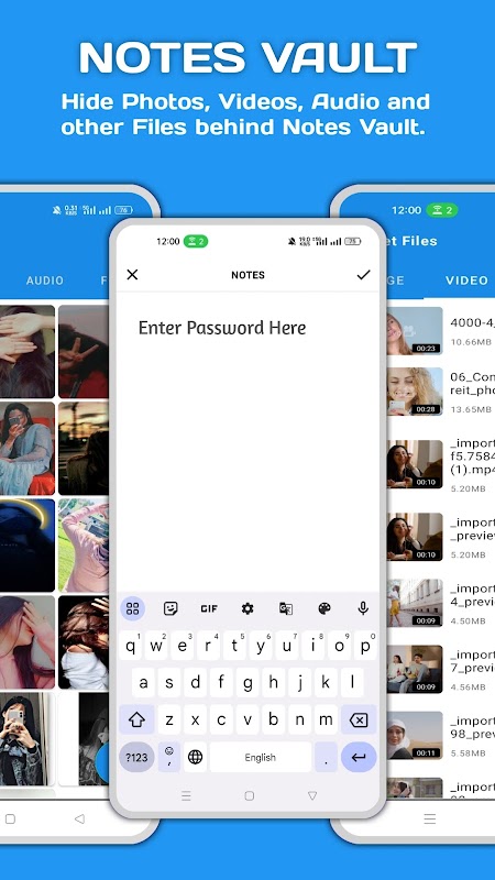 Notes Vault (casillero de fotos secretas, casillero de videos, casillero de audio y todos los demás casilleros de archivos multimedia) es una excelente aplicación de protección de la privacidad para ocultar fácilmente fotos, ocultar videos, ocultar archivos de audio, ocultar música, ocultar documentos y otros archivos y mantenerlos seguros, dentro de galería privada para bloquear archivos que no desea que otros vean en su dispositivo.