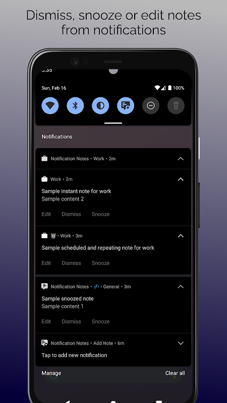 Añade rápidamente notas recordatorias como notificaciones. Usa el mosaico de Configuración Rápida o la notificación persistente para añadir notas fácilmente. Muestra las notas al instante o prográmalas para un momento futuro.