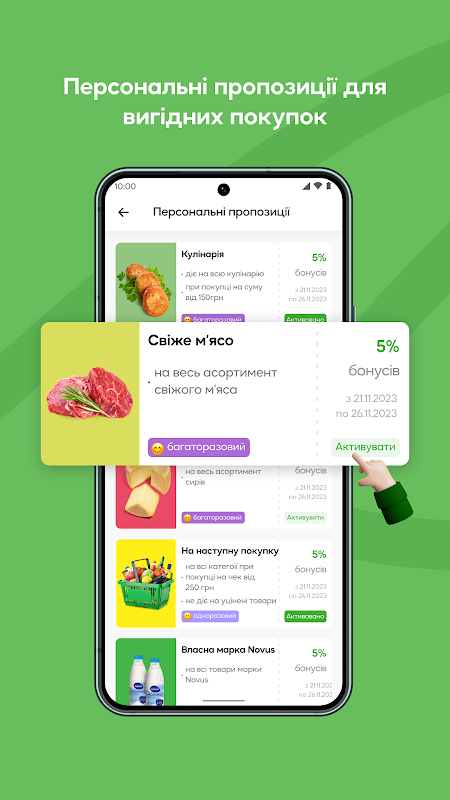 Gracias a tus compras con la tarjeta NOVUS, podemos ofrecerte las mejores ofertas solo para ti. Sigue las actualizaciones en la aplicación para estar al tanto de las promociones vigentes y recibir descuentos en tus productos favoritos, así como activar ofertas personales especiales. Una variedad de productos finamente seleccionada y la comodidad de buscar en la aplicación hacen que su comunicación con NOVUS sea agradable y productiva. Cada bandeja de productos de nuestro mercado corresponde al surtido de la aplicación. Nuestra aplicación es su asistente durante cada visita a las tiendas NOVUS.