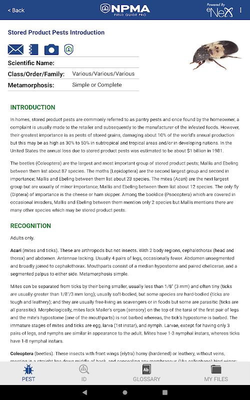 La Guía de Campo NPMA PRO es la última herramienta para los profesionales de control de plagas para identificar, controlar y eliminar plagas no deseadas. Obtenga acceso instantáneo a imágenes, información sobre el comportamiento y la biología y estrategias de control para cientos de plagas estructurales en cualquier teléfono inteligente o tableta. Con la Field Guide PRO mejorada, encuentre información de plagas más rápido con una función de búsqueda intuitiva e identifique plagas de manera más rápida con la nueva clave de identificación incorporada. La nueva Guía de campo PRO también incluye actualizaciones instantáneas de plagas que incluyen información nueva sobre las plagas y estrategias de control, lo que la convierte en la guía de campo más avanzada para los profesionales del control de plagas.