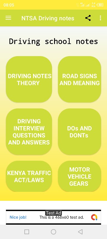 La aplicación contiene notas de la NTSA para estudiantes de autoescuela en Kenia