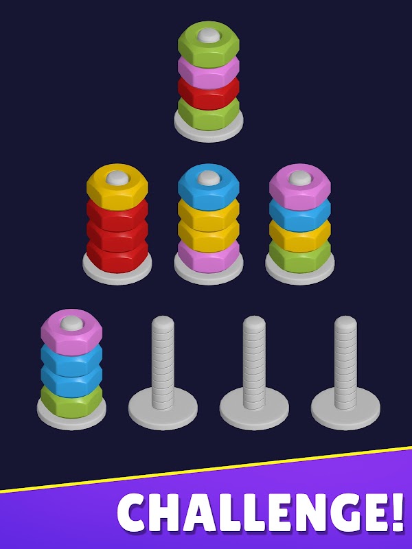Prepárese para ingresar al desafiante mundo de la organización, donde pondrá a prueba sus habilidades para combinar colores. A medida que alinees los tornillos y tuercas, te sumergirás en el viaje de conquistar las combinaciones de colores perfectas. Cada nuevo nivel aumenta la dificultad, lo que lo convierte en un juego destacado en la serie de juegos de combinación de colores.