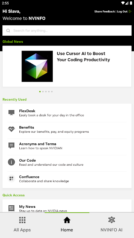 Manténgase conectado con NVIDIA y las últimas novedades de la empresa con la aplicación NVINFO. Acceda rápidamente a las principales herramientas y recursos para empleados de NVIDIA mientras viaja.