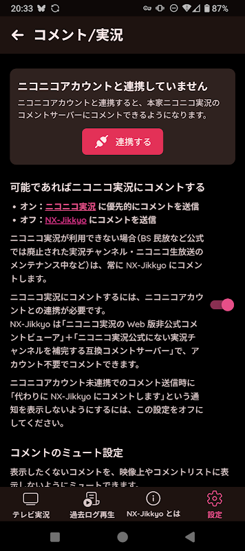 Para publicar comentarios en Honke Niconico Live, debe vincularse con su cuenta Niconico. También puede publicar comentarios en el servidor de comentarios de NX-Jikkyo cambiando el destino de publicación de comentarios en la configuración (no es necesario iniciar sesión).