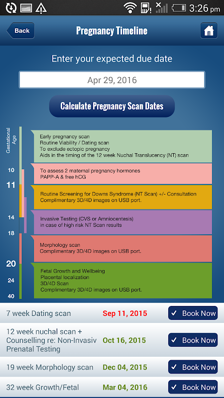 Puede introducir la fecha probable de parto de su bebé y con el toque de un botón, usted será capaz de calcular las fechas de escaneo de ultrasonido de su bebé (a los 7, 12, 19 y 32 semanas de gestación).