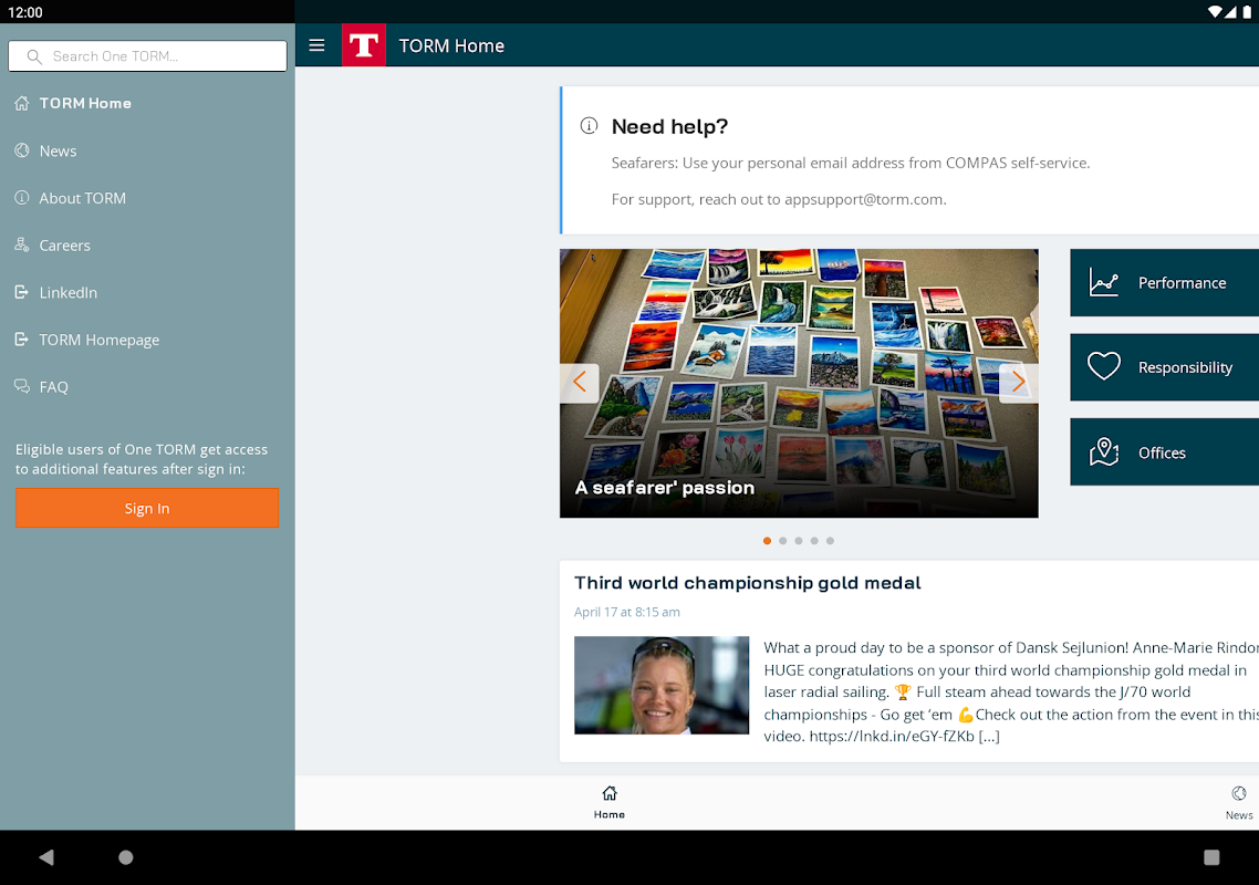 One TORM le ofrece la posibilidad de mantenerse informado sobre información importante de la empresa, trabajos y mucho más sobre nuestra empresa: móvil, rápido y actualizado.