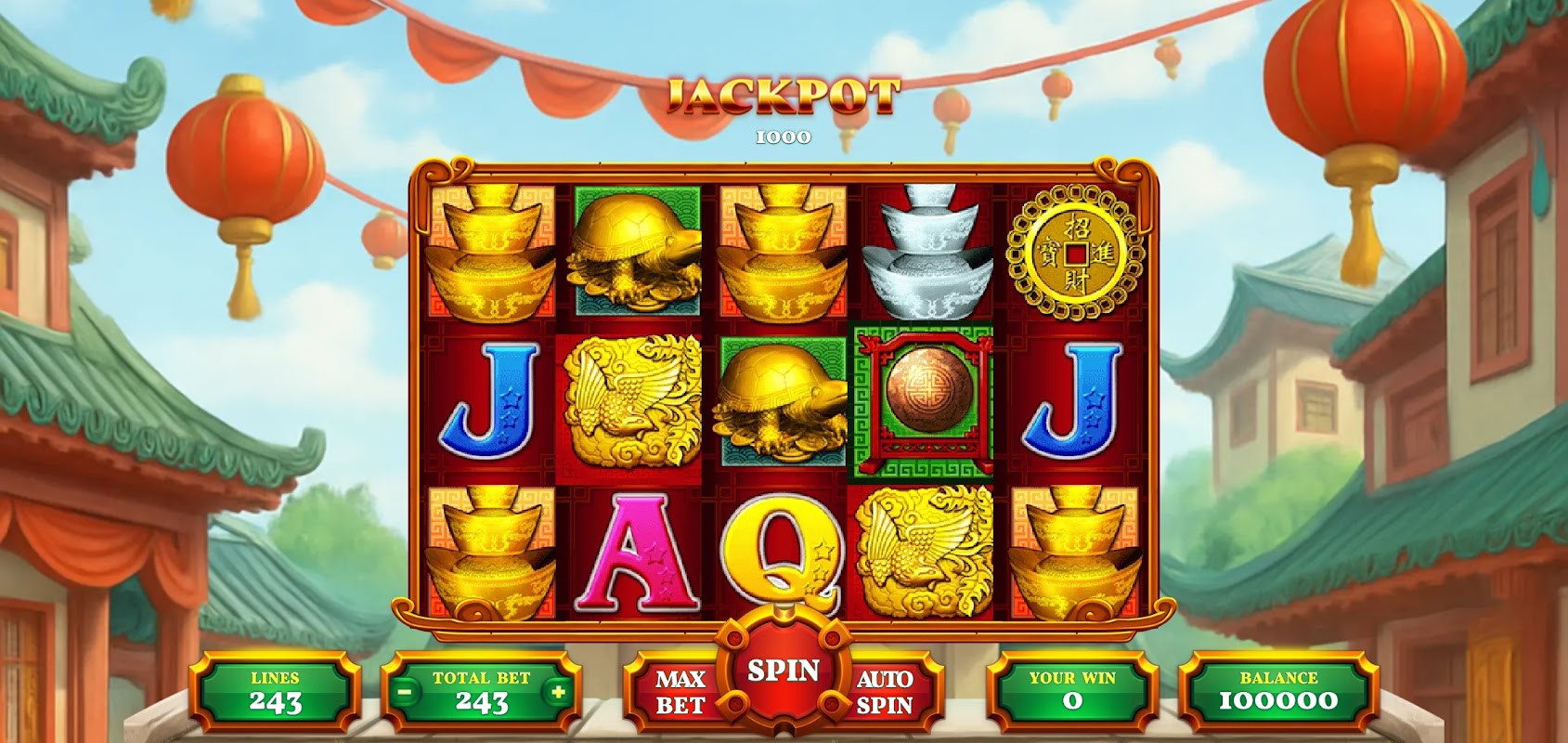 Welcome to Ong Lai Spin, a vibrant slot game full of luck, fortune and classic Asian flair! Spin the reels in a festive Chinatown scene, complete with golden turtles, silver ingots and lucky coins. Every spin is a chance to strike it rich!