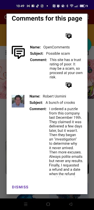 3. Reciba notificaciones sobre posibles sitios web fraudulentos. Cada vez que navega a un sitio que OpenComments aún no conoce, la aplicación buscará en Internet información que pueda indicar que el sitio es una estafa y le avisará automáticamente. Además, otros usuarios de OpenComments pueden publicar sus propias experiencias con el sitio.