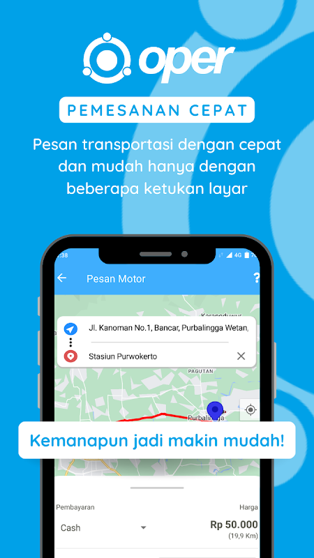 ¡Con Oper, tu vida será más fácil! Esta aplicación de transporte realizada por jóvenes en Purbalingga ofrece servicios de transporte, entrega de alimentos y varios otros servicios en una aplicación fácil de usar. Con solo unos pocos clics, puede solicitar servicios de viaje, solicitar comida de sus restaurantes favoritos e incluso solicitar servicios de limpieza o entrega.