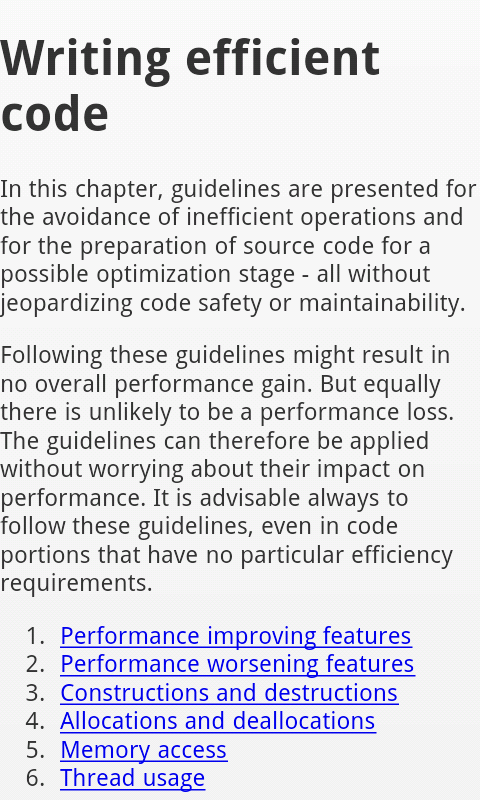 This book contains guidelines and advices on how to write efficient software using the C++ language. Software correctness and maintainability are taken into account, but are not the primary concerns of the guidelines.