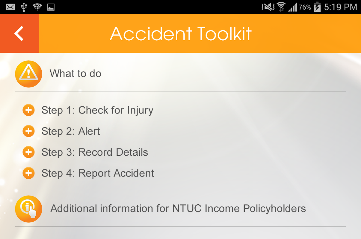 A comprehensive 4-step guide which tells you what to do in the event of an accident, there is additional information on third party claims and vehicle repair for NTUC Income Motor Insurance Policyholders.