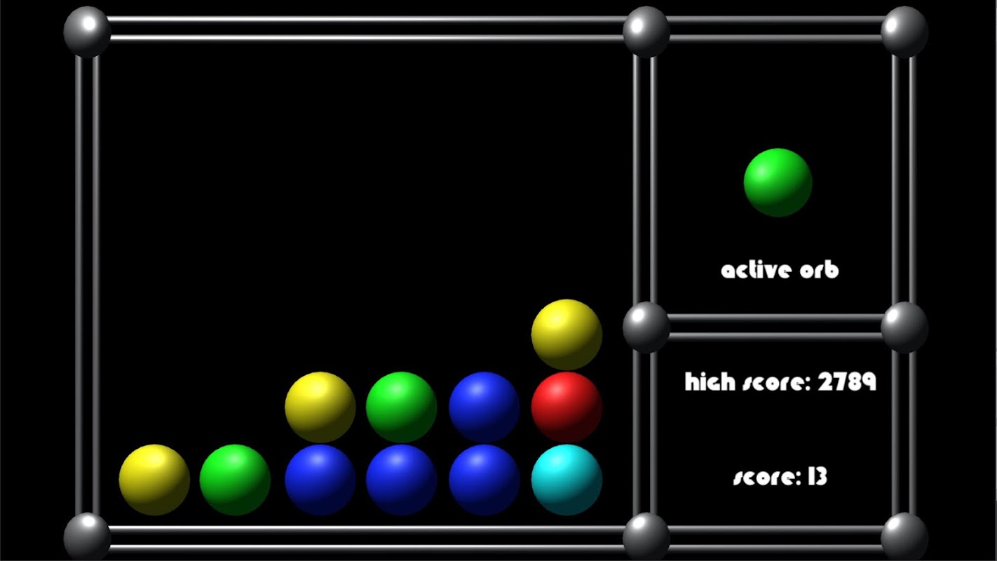 Orb Drop is a new kind of puzzle game. Different colored orbs will drop down and fill the game area. Destroy the orbs by tapping them, if they are next to an orb of the same color, then all adjacent orbs of the same color will also be destroyed. Try to keep your orbs from reaching the ceiling, if they do, then it is game over. Try to beat your best score.
