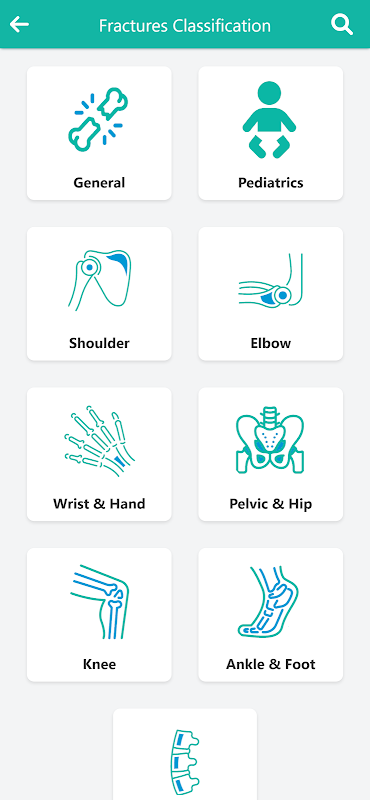La aplicación de clasificación ortopédica contiene todos los sistemas de clasificación de fracturas óseas, como la clasificación de fracturas de la cabeza del húmero (clasificación de Neer) y la clasificación de enfermedades ortopédicas, como la clasificación de la osteonecrosis de la cabeza femoral (clasificación de Vicat).