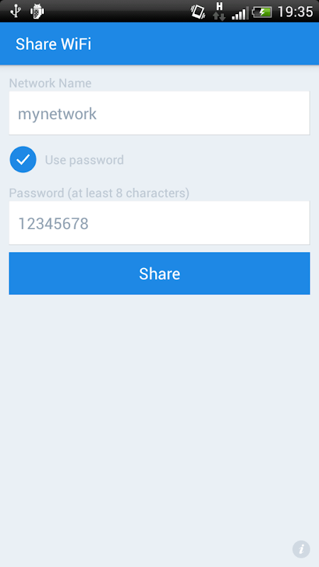 Compartir WiFi aún más fácil. Se requiere ninguna configuración complicada. Sólo necesitas una conexión a Internet. Puede establecer una contraseña para su punto de acceso WiFi personal.