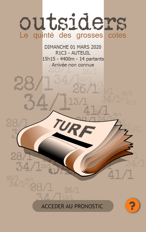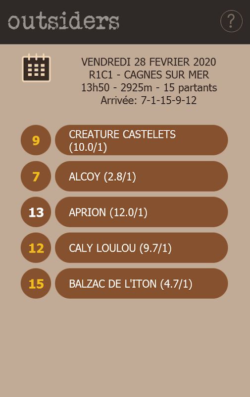 Solo se extraen cinco caballos de un cálculo excepcional que mide la posibilidad teórica de cada caballo en competición. Todo se analiza, ya sea el valor del compromiso, las actuaciones, las ganancias, la forma de los protagonistas y actores de la carrera, las condiciones de la carrera, etc. Pero lo que mejor define la aplicación es la distribución de los caballos seleccionados: si es obvio que no se omiten los favoritos del evento, "OUTSIDERS" se esfuerza por integrar a los caballos en Grandes probabilidades, que tienen una posibilidad potencial de aparecer en términos de su rendimiento promedio y general, incluso si sus últimas salidas no han convencido realmente.