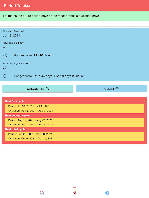 “Ciclo de Ovulación y Menstruación: Fertilidad” también tiene una función de ciclo menstrual. Esta característica le permitirá determinar su próxima menstruación. En esta función, “Ciclo de Ovulación y Menstruación: Fertilidad” también determinará los días de ovulación más probables, que son los días durante los cuales es más probable que una mujer ovule.