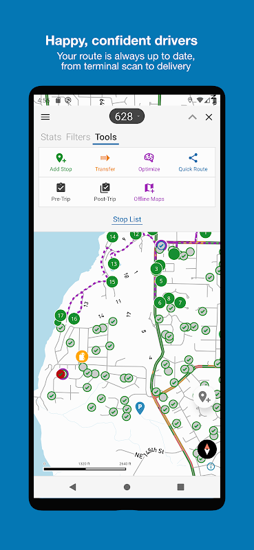 Con sus datos de FedEx FCC para todas sus rutas. Sus datos se actualizan, trazan, ordenan y organizan automáticamente. Un toque para encontrar cualquier parada o detalle del paquete.