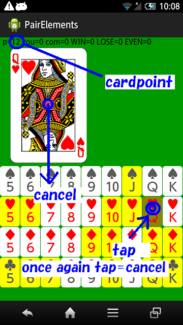 画像に説明を入れておりますので操作は分かると思います。ただ、勝負するときにカードを2枚出した状態で、カードを上にフリックすることと、カードが4枚出ている画面で画面をタップしないと判定しないところが分かりにくいかもしれません。