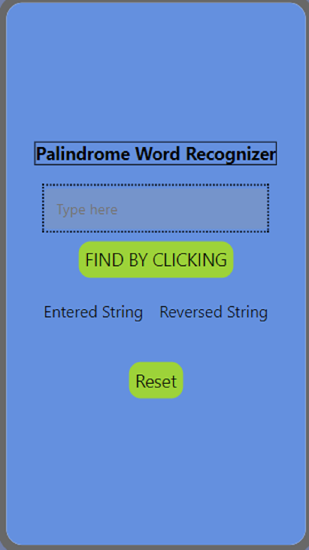 Cuando se abra la aplicación, habrá una aplicación de pantalla única con un cuadro de texto. Si escribe en el cuadro de texto 1. asegúrese de que la palabra esté en minúsculas y 2. Haga clic en "BUSCAR HACIENDO CLIC". Cuando vea si la palabra es una palabra Palíndromo o no, haga clic en "restablecer" y todo quedará vacío. dejándote con un espacio en blanco para continuar. Cuando haya terminado, salga de la aplicación.