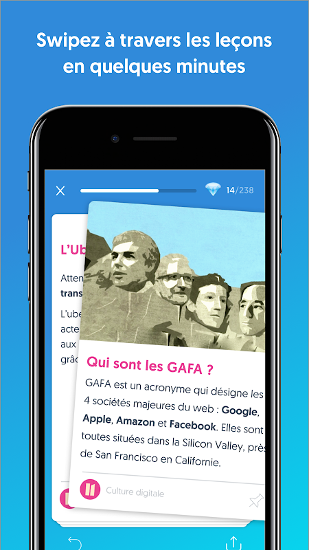 Dès que vous avez un moment libre, dans les transports ou au bureau, swipez quelques cartes pour découvrir une nouvelle leçon et améliorer vos connaissances.