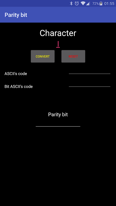 La aplicación va a imprimir el código ASCII de que characted y el binario de ese código ASCII. A continuación, se mostrará el bit de paridad simly escribiendo un carácter en el primer campo y luego pulsando el botón Convert.