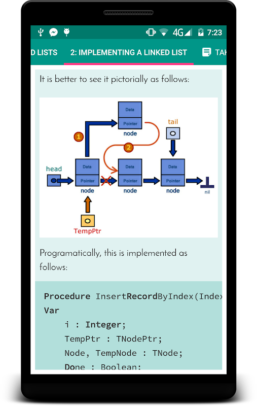 Esta aplicación se compone de un número de lecciones y una sección de lectura adicional sobre otros temas avanzados tales como la clasificación y Estructuras de Datos Avanzadas. Esta aplicación enseña al lector los conceptos básicos de la programación Pascal desde el principio hasta temas avanzados como matrices y gestión de ficheros.