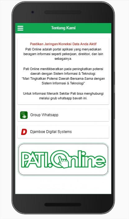 Pati Online adalah portal aplikasi yang menyediakan beragam informasi pekerjaan dan direktori di seluruh Kabupaten Pati. Pati Online menitikberatkan pada peningkatkan potensi daerah dengan Sistem Informasi & Teknologi.