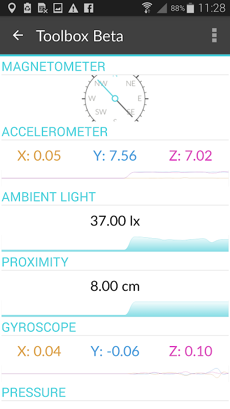 Sensors - View beautifully graphed real-time data for magnetometer, accelerometer, ambient light, proximity, gyroscope, pressure, ambient temperature, relative humidity, and GPS, and instantly know if you have a bad sensor.