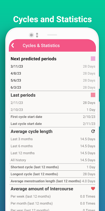 - Recordatorios y notificaciones de su próximo período y ovulación en función de sus entradas.
