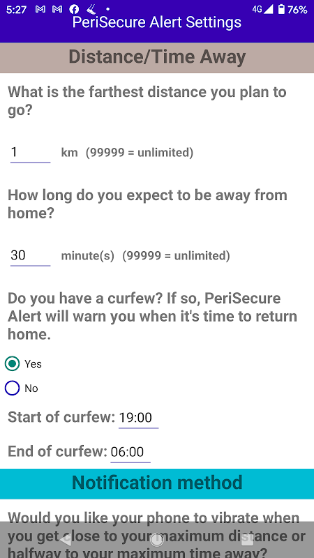PeriSecure Alert muestra al usuario su distancia y tiempo fuera de casa, notificándole con un bip y un zumbido cuando se está acercando a la distancia máxima que había establecido al comenzar, cuándo debería regresar a casa o si la batería de su teléfono se está agotando .
