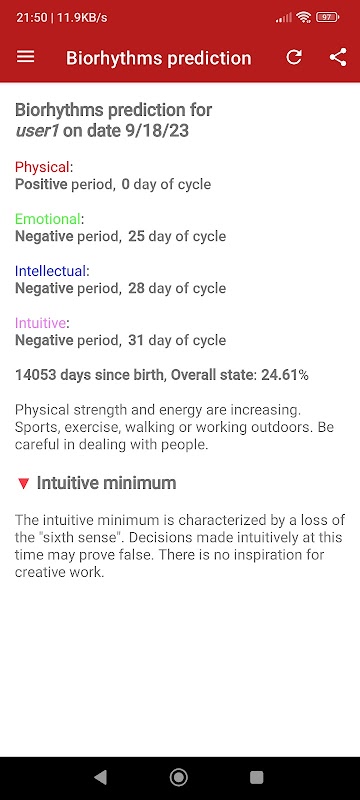 Aplicación para cálculo previsiones biorritmos personales para la fecha seleccionada.