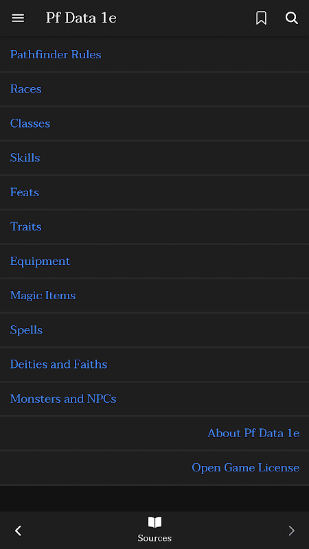 Esta es una herramienta para ejecutar un juego Pathfinder (primera edición), que contiene la mayor parte del contenido del juego abierto que se ha publicado. (Si nota que falta contenido abierto, infórmenos). Es como tener todos los libros de reglas en su bolsillo. Marque entradas para encontrar lo que necesita en todo momento.