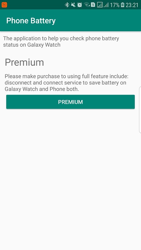 - Con la versión PREMIUM, después de verificar la batería del teléfono en Galaxy Watch, puede desconectar la conexión para ahorrar batería (teléfono y reloj). Luego, puede volver a conectarse para verificar la batería cuando lo desee.