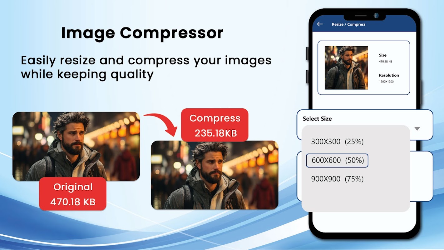 Seleccione la imagen que desea comprimir o cambiar de tamaño, elija el nivel de compresión que desee y deje que nuestra aplicación haga el resto. Con nuestro Comprimir tamaño de imagen en kb y mb, puede reducir el tamaño de sus imágenes sin sacrificar la calidad, lo que lo hace perfecto para ahorrar espacio en su dispositivo o compartir imágenes en línea usando Image Resizer gratis. ¡Pruébelo ahora y vea la diferencia usando Image Compressor Lite!
