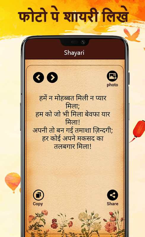 Photo Pe Shayari Likhna app has allowed you to paste any shayari, hindi poetries, hindi quotes on your photo. There are many background image for your use too. You can also use your own image.