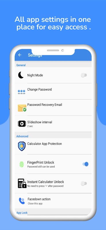 Esta app ofrece la máxima privacidad y seguridad para tus datos personales. Con funciones avanzadas como bloqueo con huella dactilar, protección con contraseña y recuperación de contraseña por correo electrónico, tus archivos ocultos estarán siempre seguros y solo tú podrás acceder a ellos.