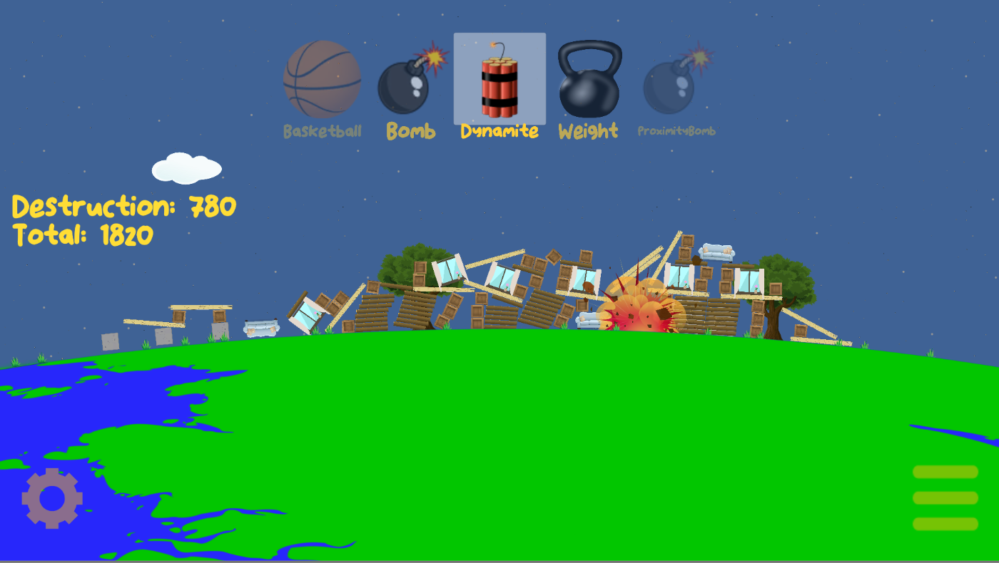 Elige entre muchas herramientas diferentes para derribar varios edificios. ¡Este juego 2D es perfecto para jugar con explosivos como DINAMITA, BOMBAS e incluso ARMAS NUCLEARES!