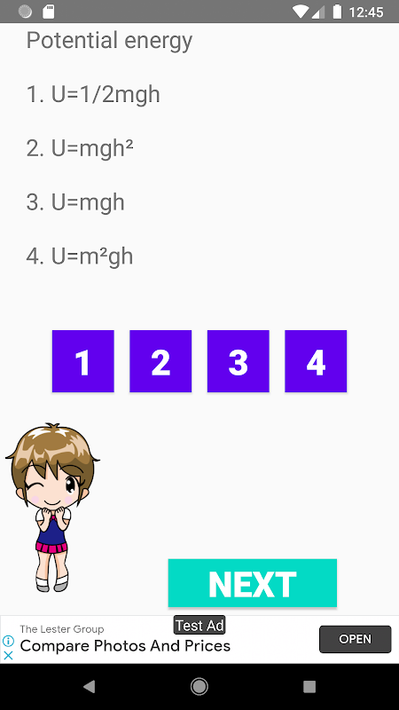 It is an application to study Physics formulas with a girl. The girl questions the physics formulas. Answer multiple‐choice examinations with the Answer button.