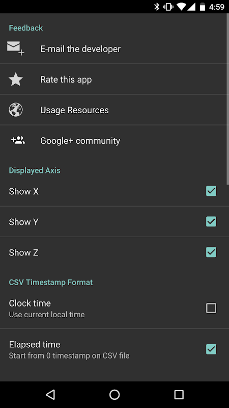 This app measures and displays a graph of Angular Velocity (rad/s) vs. Time (s) that can be exported to Google Drive or in an e-mail as a .txt attachment with comma separated values (csv). This gyroscope can be used to measure rotational and/or periodic changes in the x, y, and z planes.