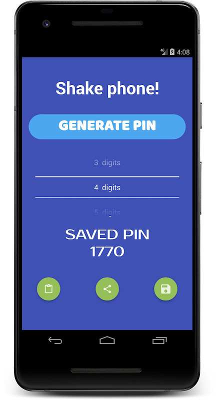 PIN Code Generator crea códigos PIN aleatorios sobre la marcha. Agite su dispositivo, genere un código PIN aleatorio y guárdelo para su uso posterior. Comparta sus códigos PIN por correo electrónico, mensajes, Dropbox y redes sociales o copie su código PIN en el portapapeles.