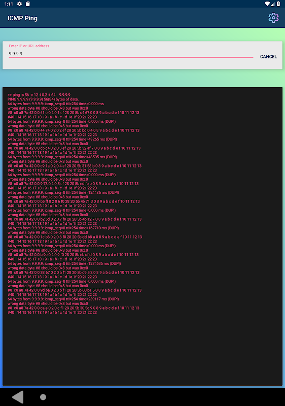 La aplicación ICMP Ping es una herramienta de red simple y limpia para ejecutar comandos de ping desde su teléfono o tableta. Esta es una herramienta Ping fácil de usar, ya que puede ejecutar un comando ping con direcciones IPv4 o IPv6 o usar el nombre de host de un servidor remoto. Para usuarios más avanzados, puede establecer parámetros adicionales para hacer ping al comando como intervalo, tamaño de paquete ICMP, conteo de paquetes, TTL y muchos más.