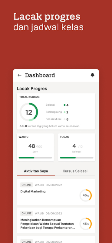 Lacak Progres: Dari dasbor Pintar, kamu bisa melacak progres belajarmu. Kamu bisa lihat berapa materi yang sudah kamu selesaikan, berapa tugas yang sudah kamu kerjakan, dan kelas apa saja yang mesti kamu ikuti setiap harinya.