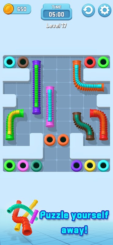 En Pipe Jam 3D, tu misión es simple: ¡desliza las tuberías, combina sus colores y guíalas a través de los portales correctos!