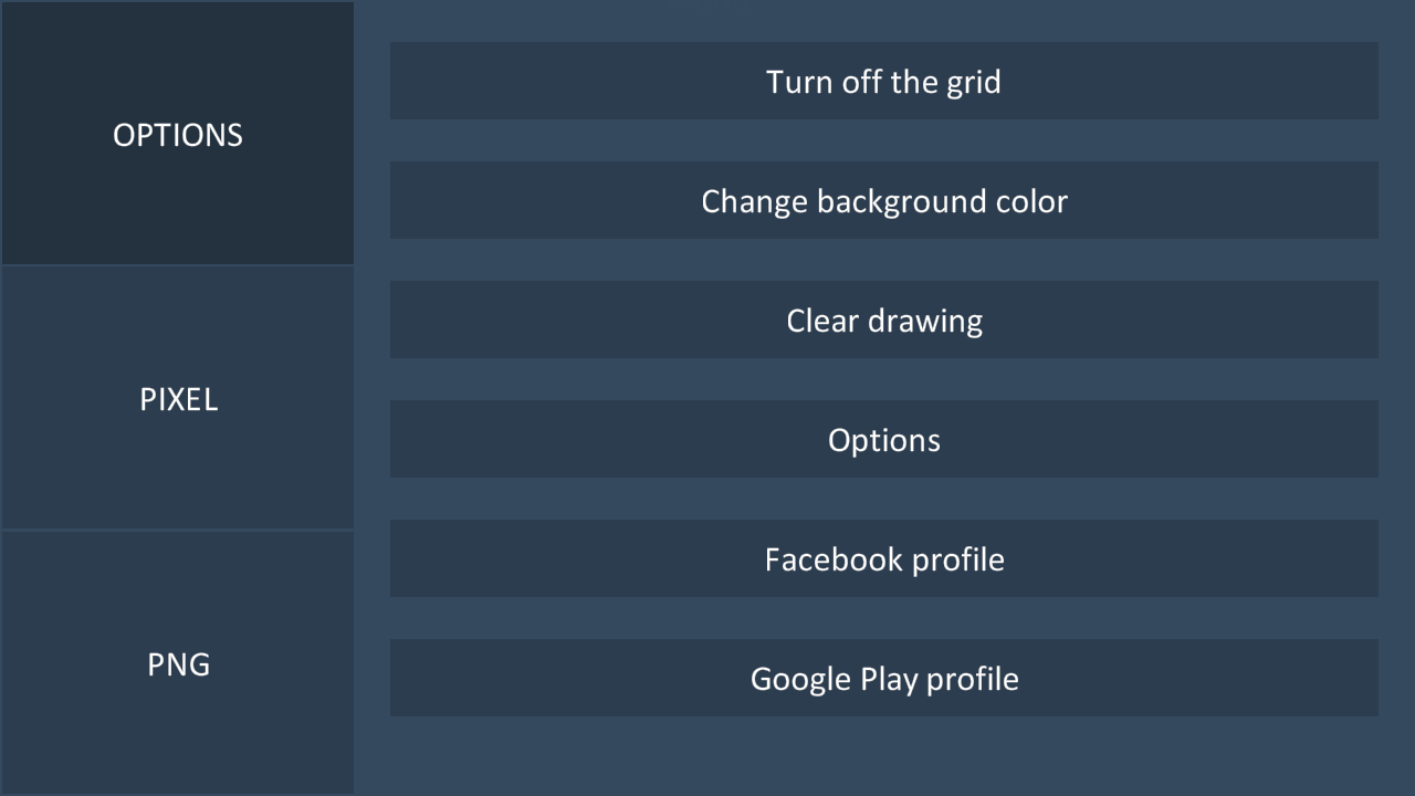 App que te permite hacer pixel art. Usted puede seleccionar un color para cada píxel, moverse por deslizamiento, zoom in / out y cambiar los colores. Además es capaz de guardar su trabajo en un archivo y cargarlo más tarde. También puede guardar la captura de pantalla al archivo .png y compartir su trabajo en facebook. Divertirse!