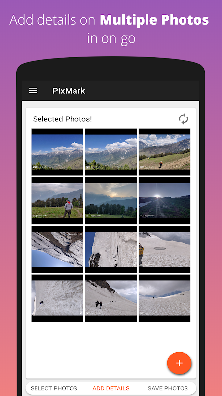 PixMark te permite agregar los detalles de tu viaje en una gran cantidad de fotografías con un solo clic. Puede agregar los detalles que desea agregar a sus fotografías como marca de agua. Simplemente ingrese el texto que desea agregar, seleccione las fotos de su galería y guarde todas las fotos de una vez con solo un clic.
