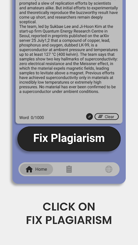 Esta aplicación de reparación de plagio es muy fácil de usar, solo necesita colocar el contenido en el campo de texto, elegir el modo y luego hacer clic en el botón de reparación y el contenido se eliminará del contenido. Además, también puede extraer el contenido de los archivos pdf, word y text. Simplemente seleccione el archivo desde el dispositivo móvil y la aplicación extraerá automáticamente el contenido y lo pegará en el campo de texto.