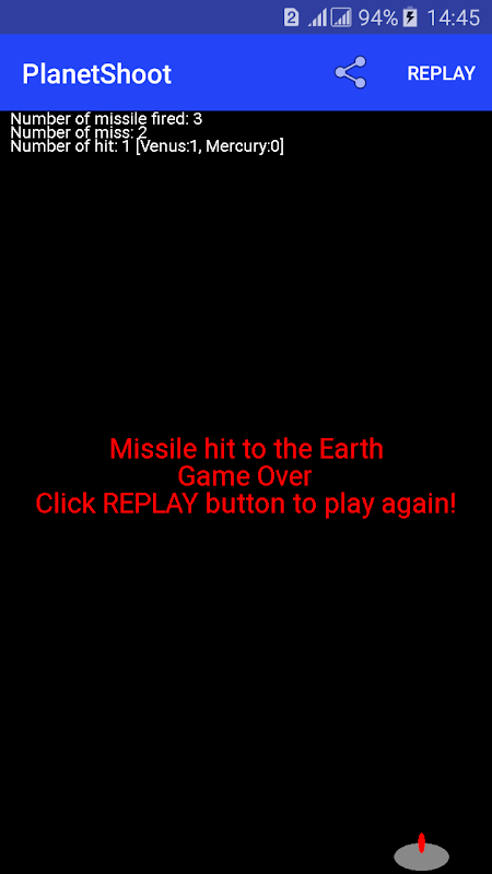 Guía: Para jugar a este juego. disparas misiles para destruir el Venus y el Mercury. Solo tienes 50 misiles. Toca la pantalla para disparar. Para proteger la Tierra, debes disparar 15 misiles a Mercurio y 30 misiles a Venus. Si los misiles golpean la Tierra o la Luna, el juego termina inmediatamente. Haz clic en el botón Repetir para intentarlo de nuevo.