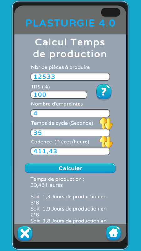Ce logiciel a pour but de simplifier les calculs de production en plasturgie ou en industrie en général. Vous pouvez calculer rapidement votre TRS vos PPM, votre taux de rebuts, le temps de production pour réaliser un certain nombre de pièces, les quantités de matière vierge et de colorant utiles à la réalisation de ces pièces. Le logiciel prend en compte des spécificités de l'injection plastique comme le nombre d'empreintes et le pourcentage de rebroyé et de colorant. Le logiciel est composé de calculs que vous pouvez faire indépendamment les uns des autres, vous pouvez aussi enregistrer vos données comme le poids de votre moulée, le pourcentage de rebroyé, le pourcentage de colorant, le nombre d'empreinte, le temps de cycle ou la cadence et les utiliser dans tous les calculs sans avoir à les renseigner de nouveau. Ce logiciel n'a pas pour but de remplacer un ERP mais peut vous permettre rapidement de savoir si par exemple il vous reste assez de colorant ou de matière pour finir votre production. De connaitre le nombre de jours1024 d'utilisation d'une machine pour savoir si vous pouvez accepter une nouvelle commande. De connaitre instantanément votre TRS ou vos PPM. De voir en quelques secondes si les données de vos ordres de fabrications sont cohérentes avec la réalité du terrain. C'est une sorte de calculatrice rapide dédiée à la plasturgie ou l'industrie en général qui vous évite de devoir faire à la main les calculs et conversions diverses pour obtenir vos informations.